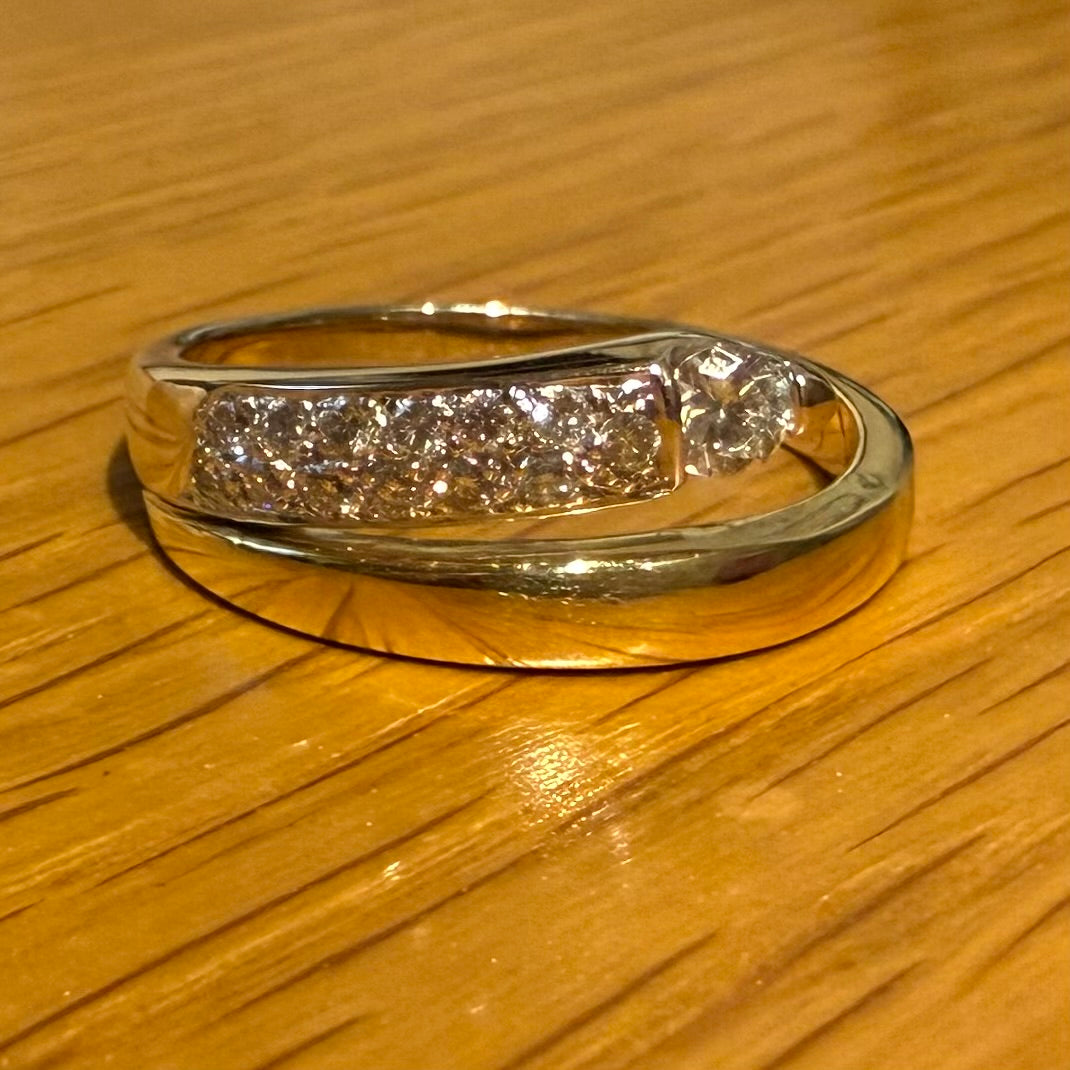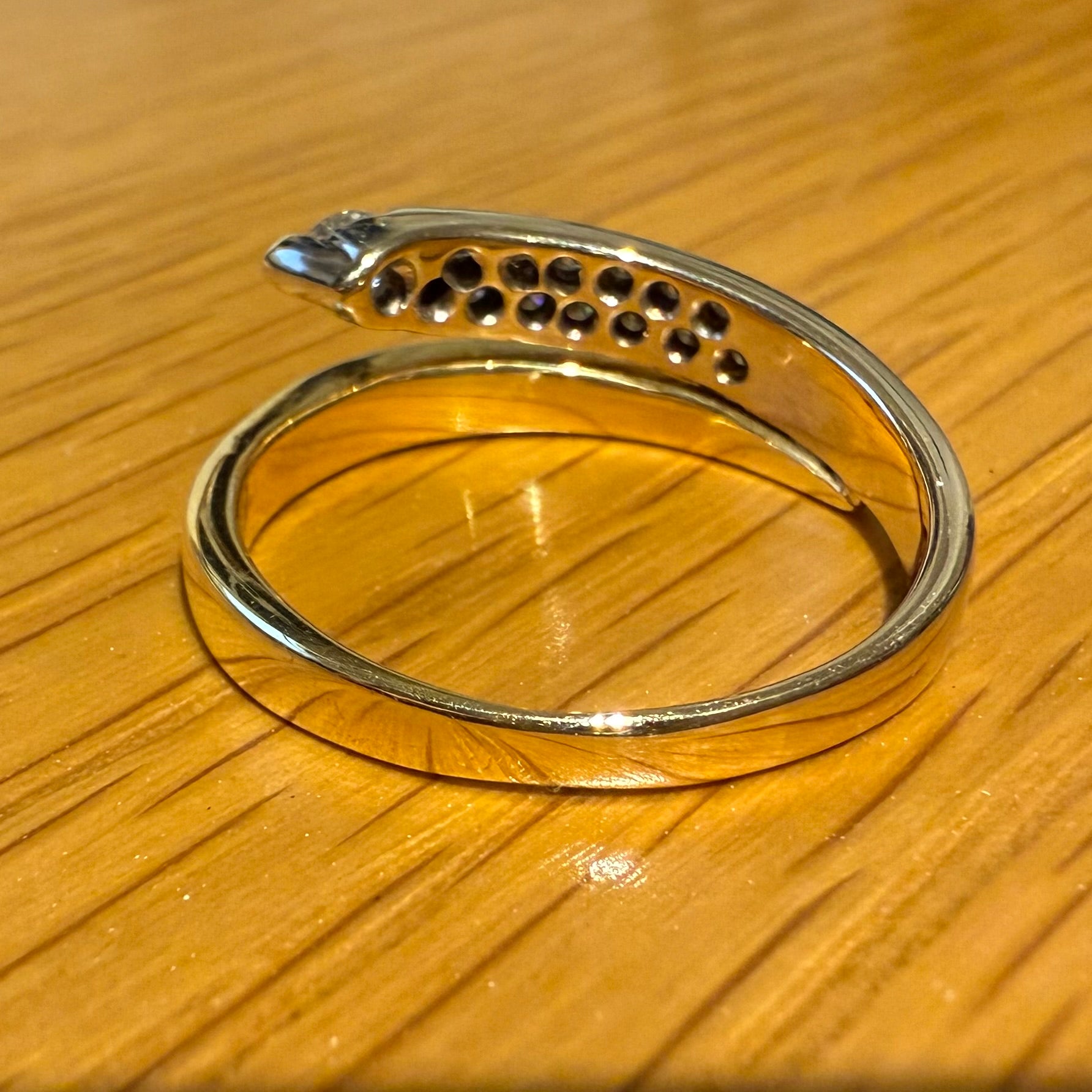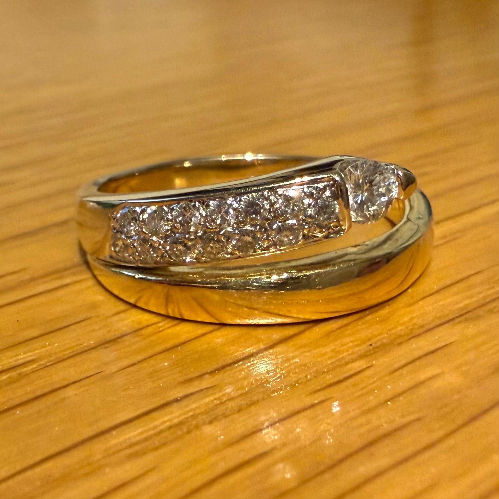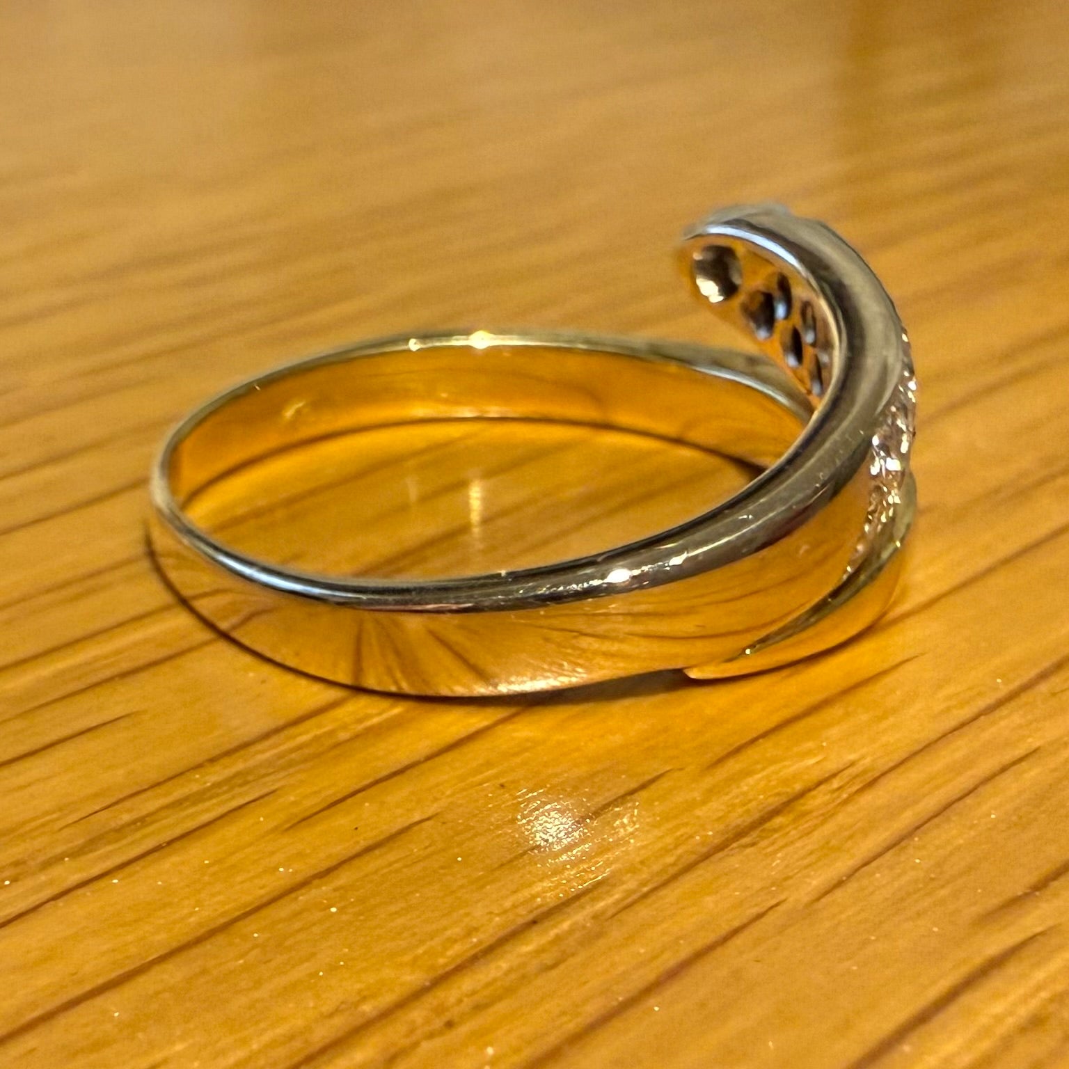 A touch of elegance and quirkiness come together in this 18ct yellow gold crossover ring. Adorned with approximately 0.40ct total diamonds, including a stunning 0.15ct diamond, this ring is perfect for adding a unique touch to any outfit.