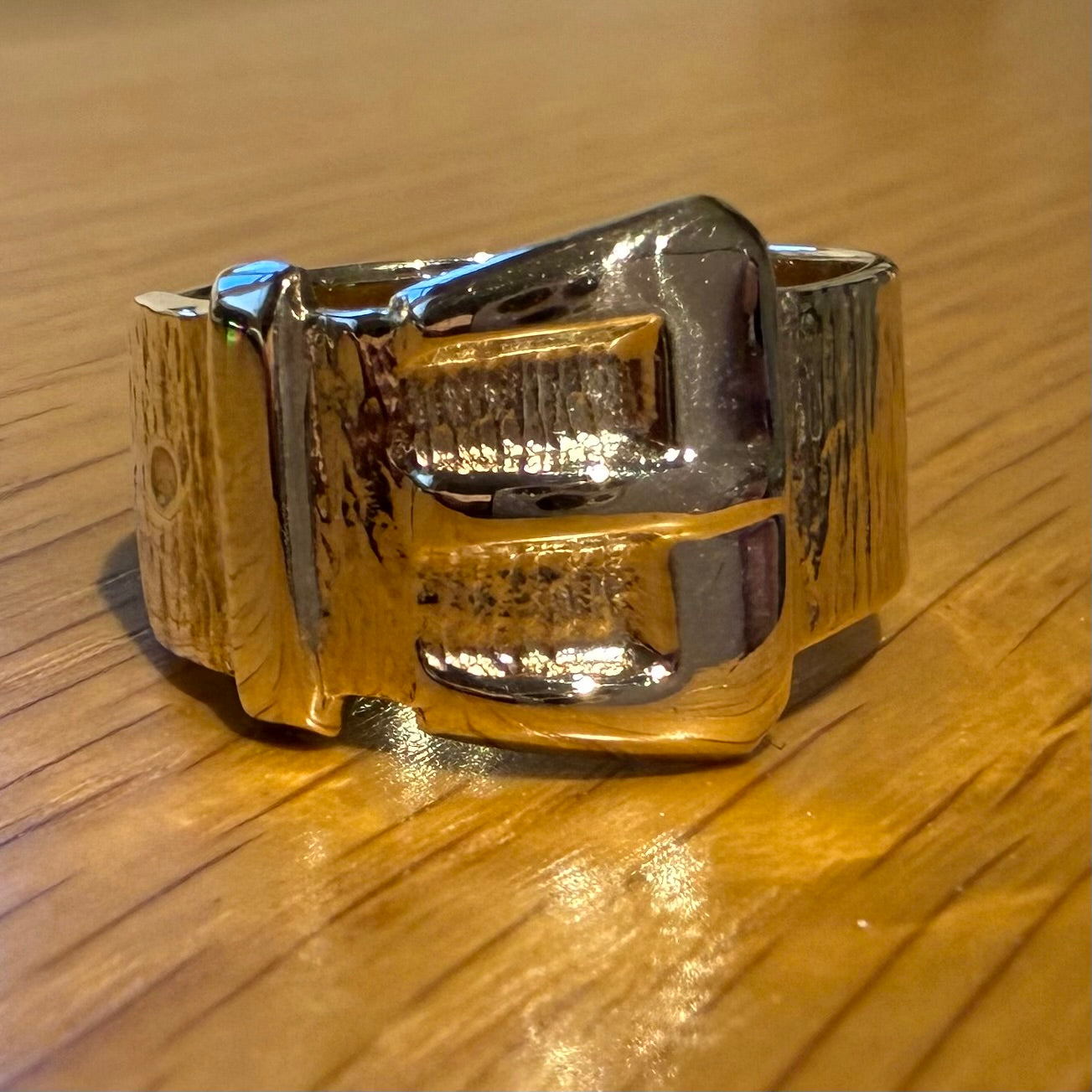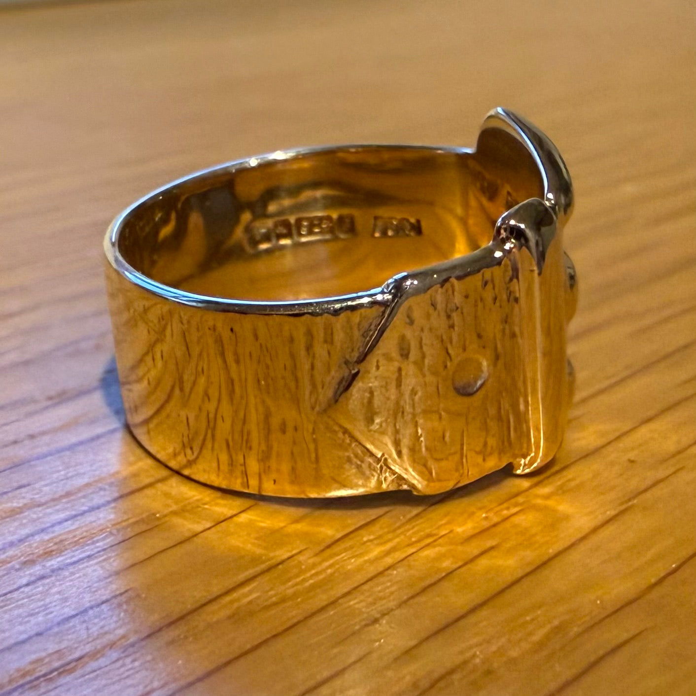 This 9ct yellow gold buckle ring features a distinctive bark effect pattern, adding texture and character to its 9.12mm wide band. The buckle detail measures 14mm, creating a refined focal point that blends classic design with contemporary elegance. Perfect for those seeking a unique yet timeless accessory.