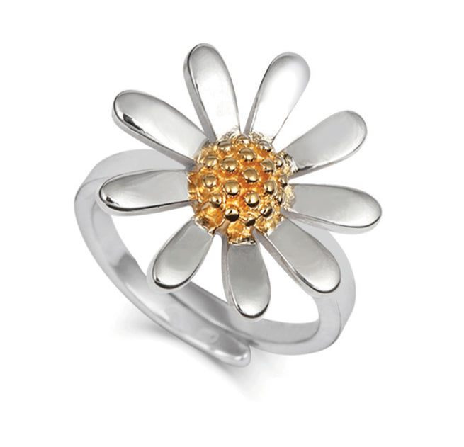 Indulge in the beauty of this Daisy Ring, a must-have for any fashion-forward individual. This adjustable ring boasts a delicate daisy design with a luxurious gold plated center, making it the perfect accessory to add a touch of elegance to any outfit. Its versatility to fit any size makes it a truly exclusive piece.