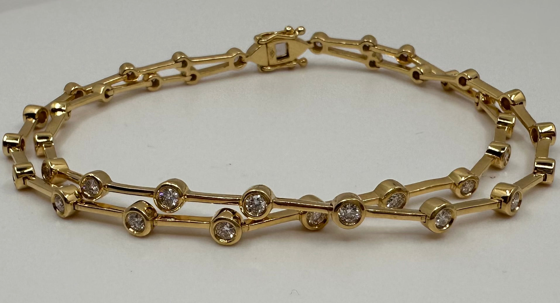 Expertly crafted, this Diamond Bracelet features 18ct yellow gold and 38 round brilliant cut diamonds in a stylish 2-row bar design. The diamonds are securely set in rubover settings and fastened with a box clasp and 2 figure of 8's. Measuring 7" in length, this bracelet exudes elegance and sophistication. bracelet weight 11.06g