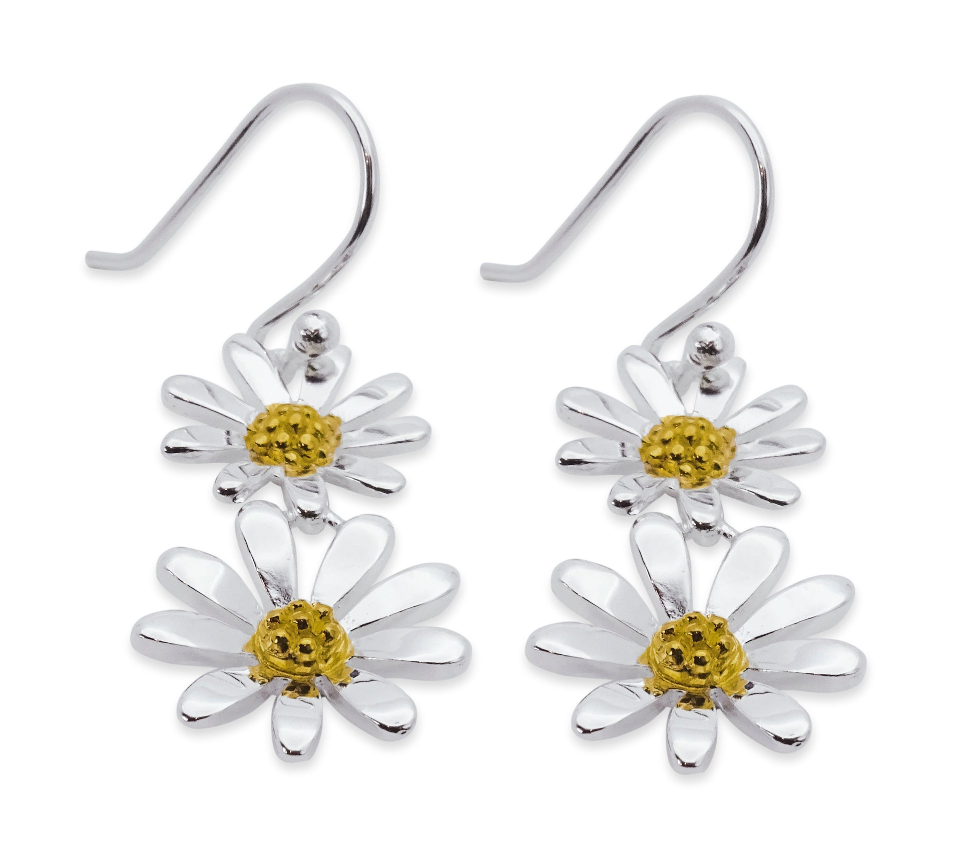 Embrace nature and take your style to the next level with our Silver Double Daisy Drop Earrings. The double drop design features contrasting sizes, accented with a gold plated centre for an eye-catching and gleaming finish. Dare to stand out and make a statement with these daring and bold earrings!