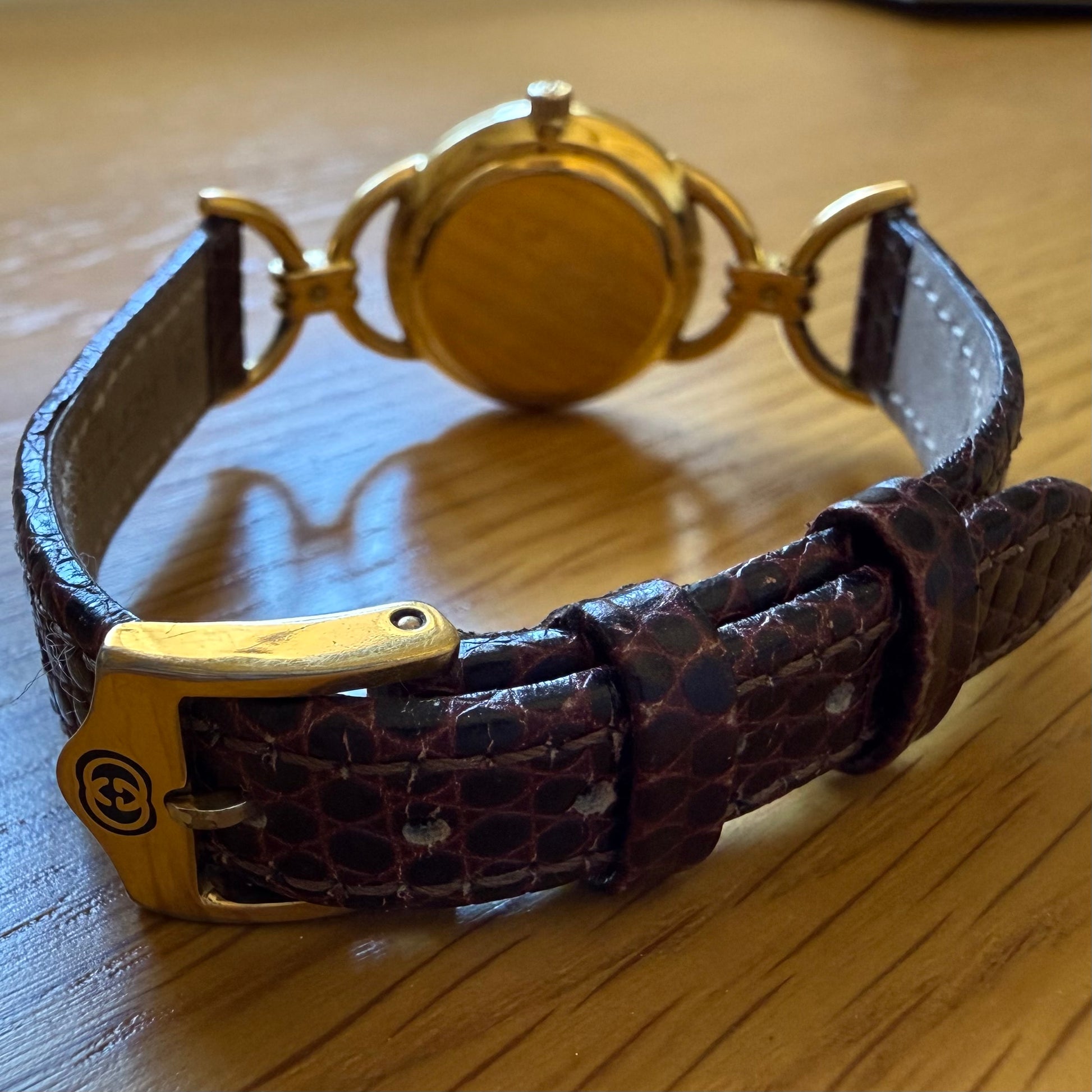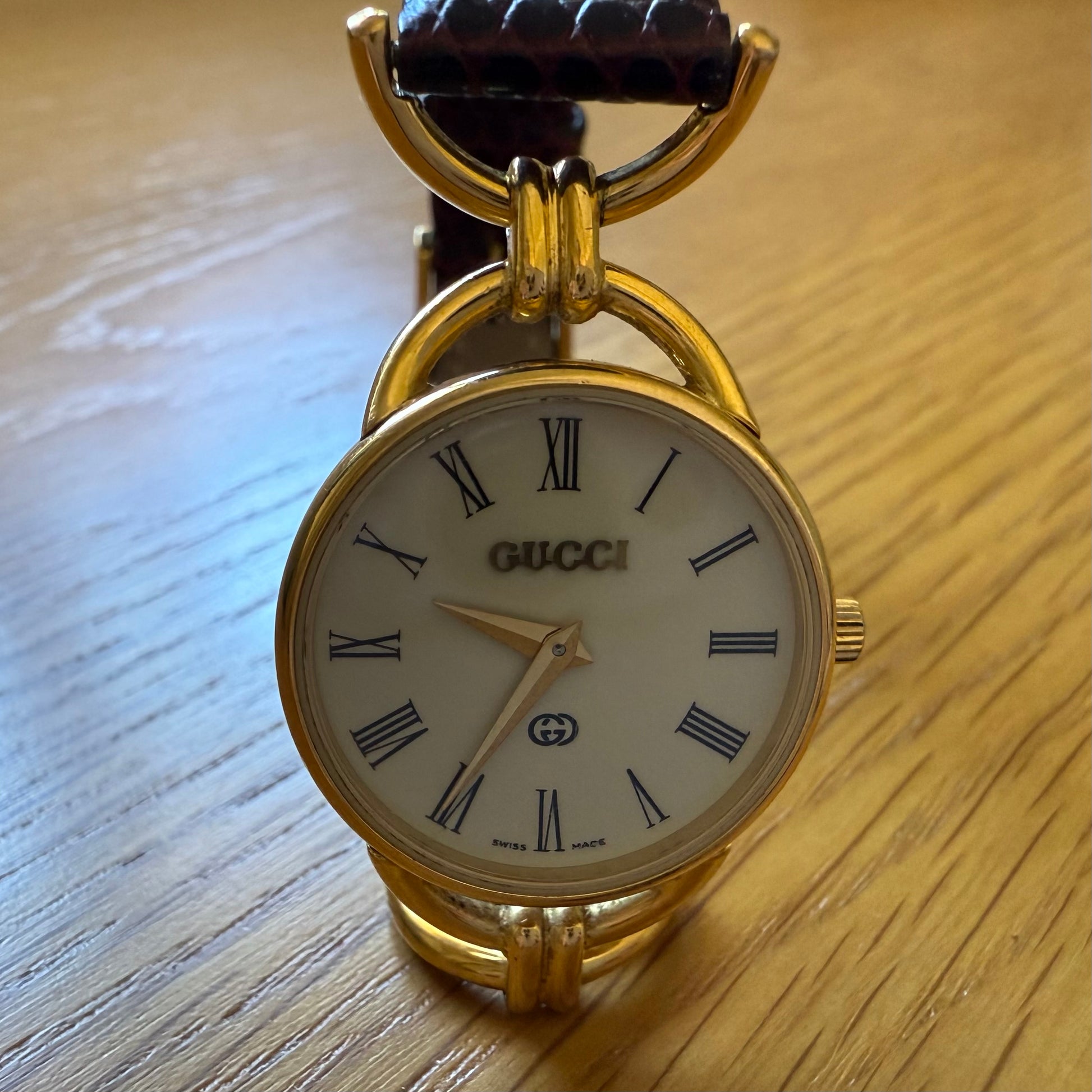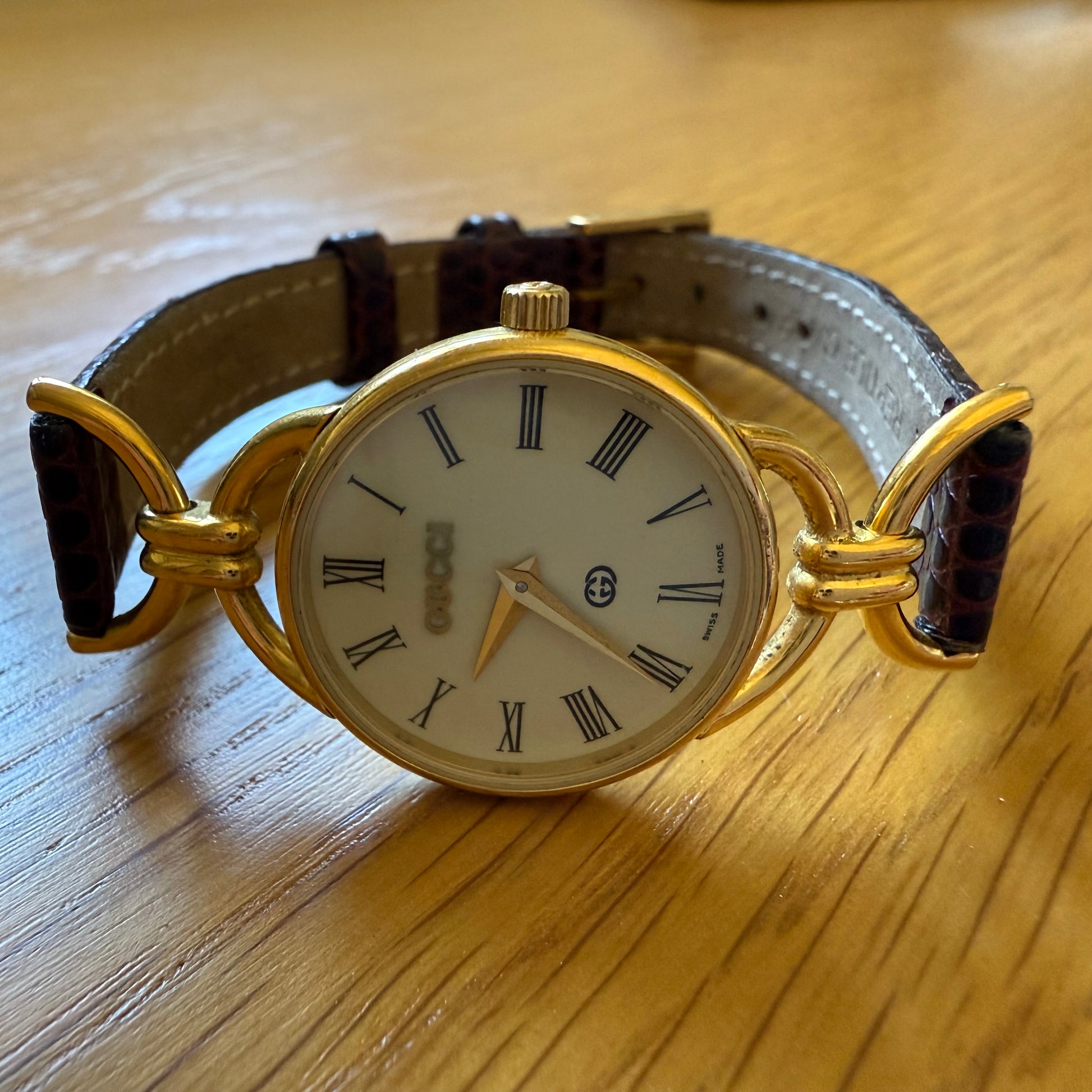 This vintage Gucci watch features an 18ct yellow gold plated case, complemented by a white dial with black Roman numeral markers and elegant gold dauphine hands. Powered by precise Swiss quartz movement, it ensures reliable timekeeping. The brown leather strap is finished with the original Gucci buckle, combining classic style with authentic craftsmanship. A refined accessory for collectors and connoisseurs of luxury timepieces.